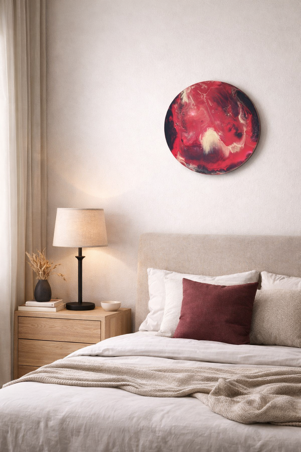 An abstract circular composition in layered reds. The piece balances warmth and stillness, creating a calm yet emotionally charged focal point that brings depth and quiet intensity to a space.